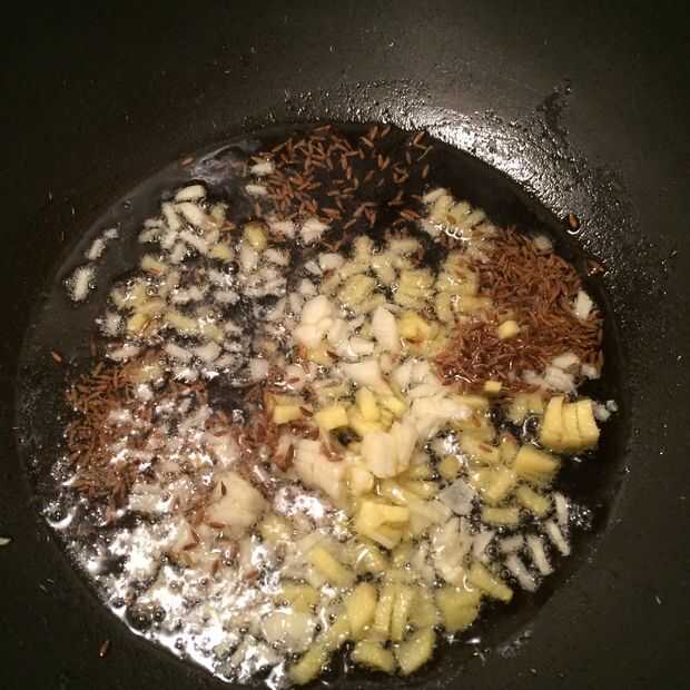 En una sartén de 10" sobre un fuego medio 2 cucharadas de aceite de mezcla 2 cucharaditas de semillas de comino, ajo y jengibre manten mezcla hasta marrón claro.
