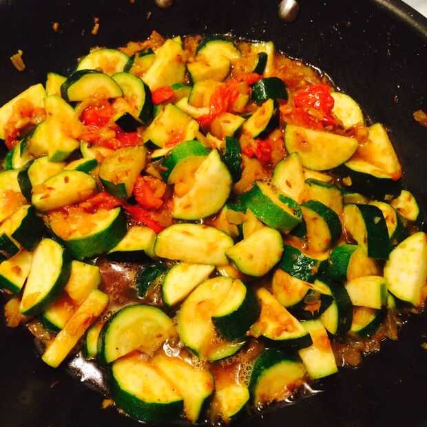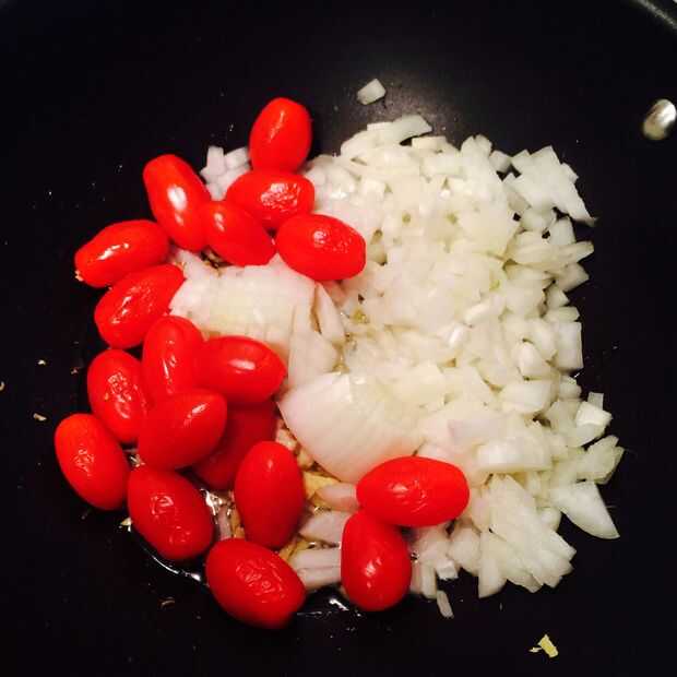 Añadir 2 cubierta de cebollas y tomates picados, dejar cocinar a fuego lento durante 10 a 20 minutos (mantener agitación en el medio).