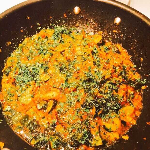 Al final poner la restante 1/2 taza cilantro fresco sirven con comino frito arroz, roti o naan.