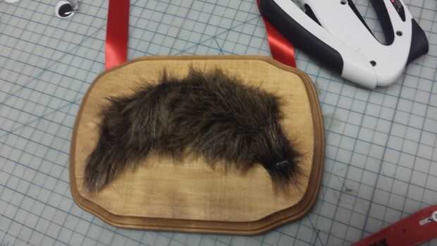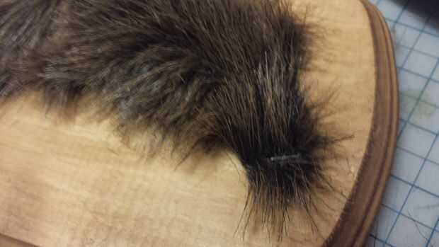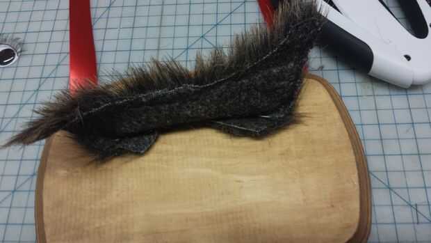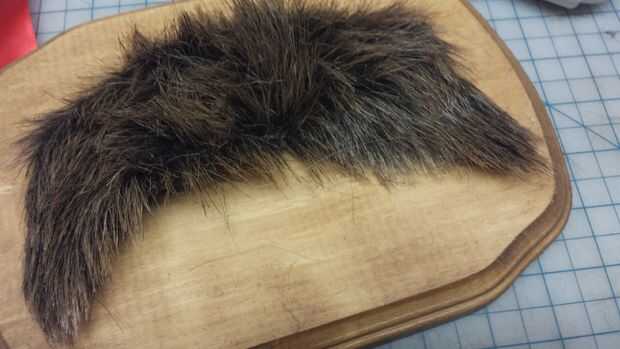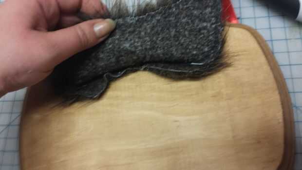 Para adjuntar el bigote a la placa, había grapada al revés de la tela a la placa, luego lo volcó y con grapas a la parte inferior, con el pelo largo para ocultar las grapas.