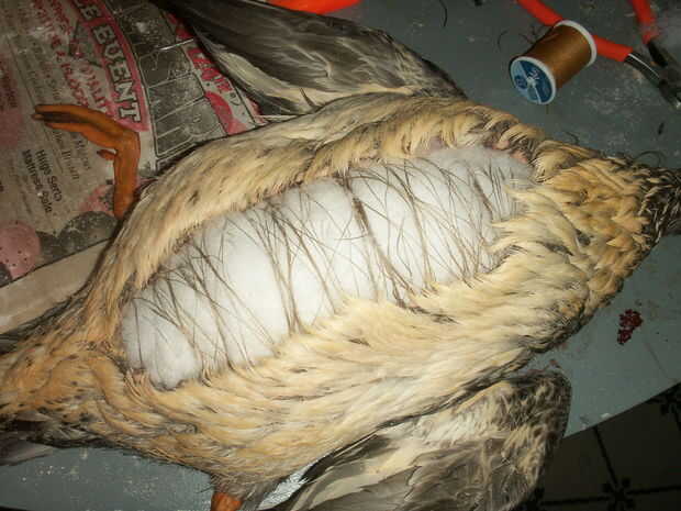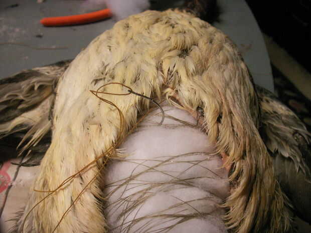 Asegúrese de que ve bien y no te preocupes si no es robusto. Ahora viene la diversión parte. Es el momento de coser hacia arriba. Comenzar cosiendo cualquier agujeros grandes que puede haber cortes en la piel. Coser con las plumas y cosa lentamente para que pueda obtener las plumas del camino. Asegúrese de que ninguna de las plumas quedan atrapada bajo el hilo!