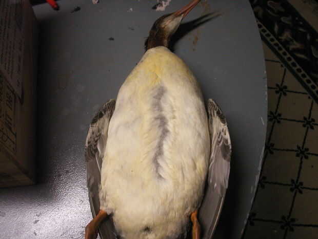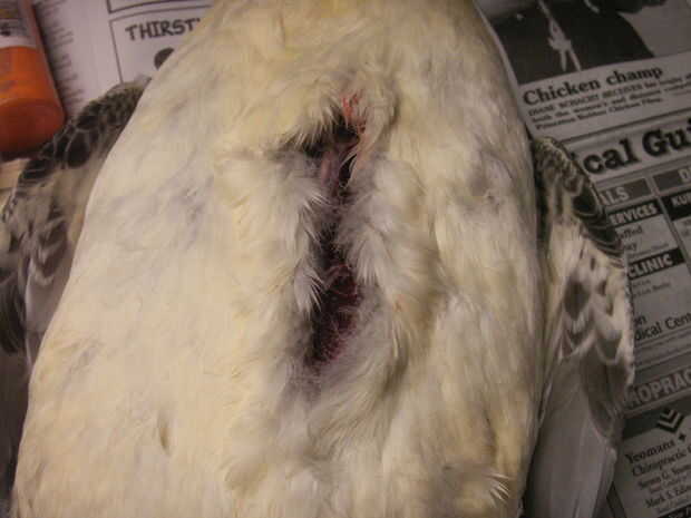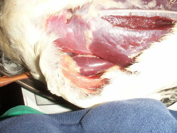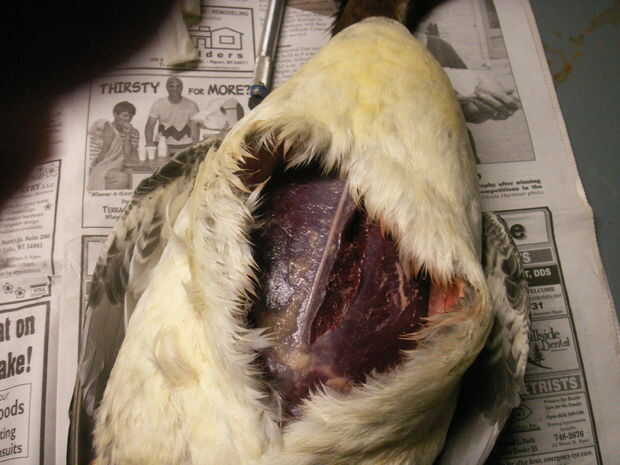 Bueno ahora a empezar. OK, el primer paso es levantar el vientre del pájaro. Tenga cuidado de no romper o doblar cualquier plumas. Las plumas son importantes. Ahora mueva con cuidado las plumas en una línea recta sobre el esternón. moverlos para que puedas ver la piel.