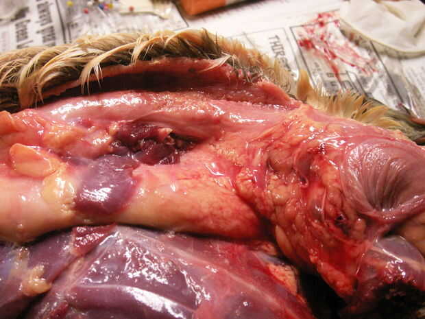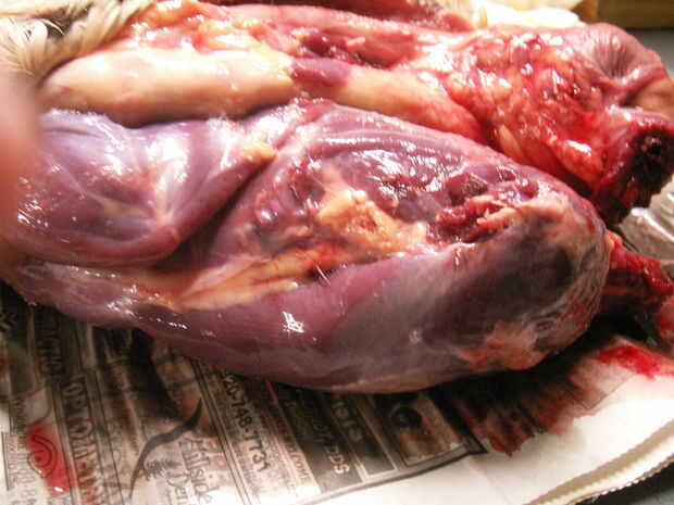Hacer lo mismo para la otra ala y seguir pelando la espalda. Tenga cuidado al llegar a la zona lumbar. La piel es más delgada y frágil. Trabajo hasta llegar un poco más allá de las piernas. puede que necesite lavar la sangre de su pájaro otra vez.