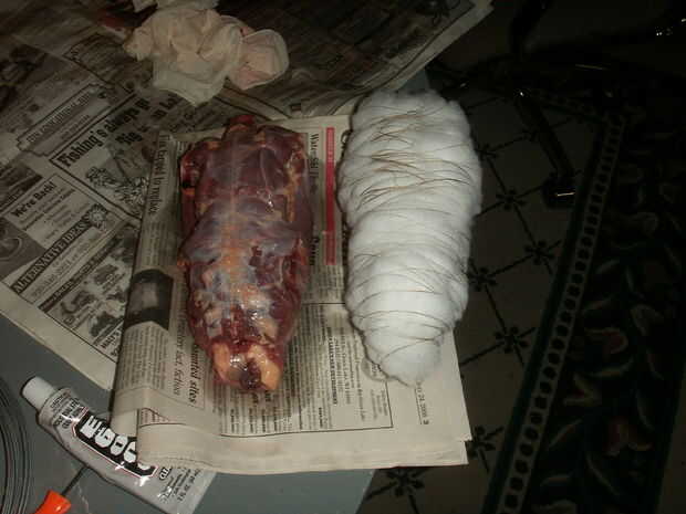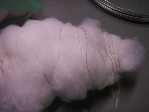 Mantenga agregando grupos de relleno y embalaje para que sea el tamaño y la forma de su cuerpo de las aves. Tardará un rato y un montón de hilo, pero usted conseguirá. No será perfecta, así que no se estrese sobre él. Una vez que termine el cuerpo cortado dos piezas de su cable de 6 pulgadas de largo. Pegar un extremo del alambre en donde las piernas se utilización para fijarse en el cuerpo falso.