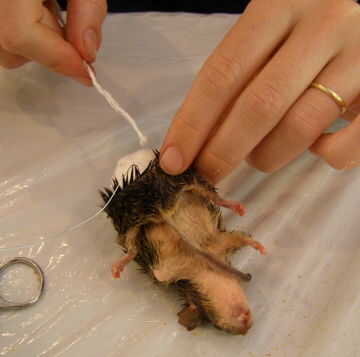 Cuidadosamente insertar la torcedura del alambre y algodón en la cola y ejecutar la medida de lo posible. No te preocupes si no va todo el camino a la punta y no forzarla, no desea rasgar o Hágale un agujero en la cola. Es muy fácil insertar accidentalmente el cable a través del recto, pero usted sabrá inmediatamente si ya tienes el agujero equivocado. Prueba de nuevo para la cola y hacerlo bien esta vez.