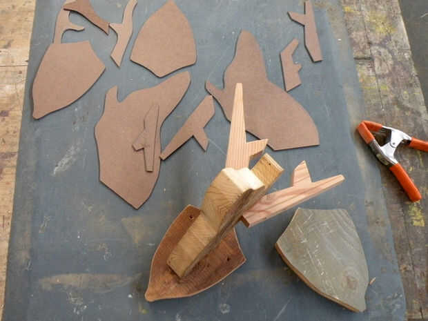 Los cuernos son de forma libre, sobre un pie de largo cada una, algunos angulares, algunas curvas. Alternativamente, cortadoras de tienda al azar, pedazos de palo de escoba, pedazos de chatarra, las posibilidades son infinitas. Sólo recoger algo con una presencia escultórica, virar y ver cómo se ve.