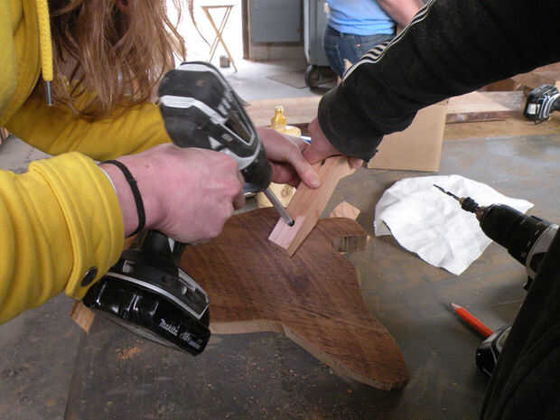 Una línea central en la parte posterior de la placa de la huelga y haga dos agujeros, en hundirse para que conducen los tornillos al ras. Conducir los tornillos por lo que sólo asoman por la parte delantera de la placa; Utilice las puntas de tornillo para localizar la cabeza de venado y céntrela. Pre-taladro en la cabeza de los ciervos. Superficies de contacto en pegamento de la capa, y luego los tornillos hogar.