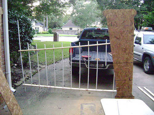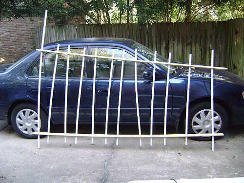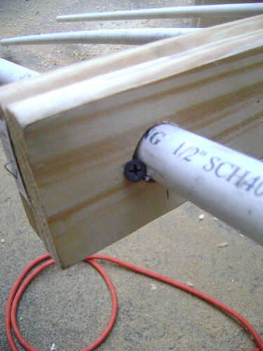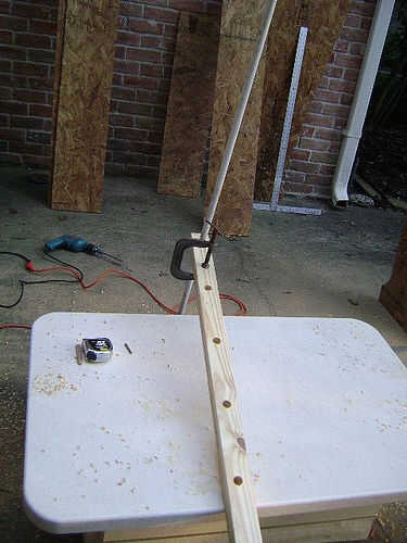 Inicialmente, todo lo hice recto y uniforme, pero el efecto fue... bueno, recto e incluso. Realmente quería esto parece viejo y descuidado así que me la segunda vez los agujeros para los tubos de PVC offset y al azar.