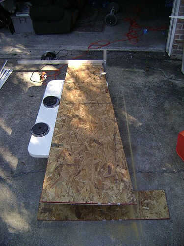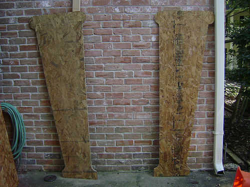 Empecé por tratar de colocar las columnas de la madera contrachapada de tal manera que llego al máximo de una hoja. Decidí que la mejor cosa a hacer sería sólo rasgar la madera por la mitad longitudinalmente y luego fije con abrazaderas las dos mitades juntas. Esto me permitiría esbozar en un lado y recortar de los lados simultáneamente. Puesto que no tengo una plantilla o incluso cualquier medición por, era muy importante que mantener las hojas juntas.