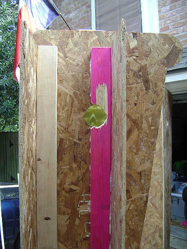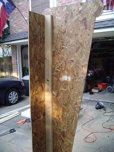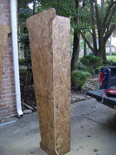 Os adjunto primero la 2 x 4 al frente de la columna (dejando suficiente espacio para el espesor de la madera contrachapada) con tornillos y pegamento del gorila.