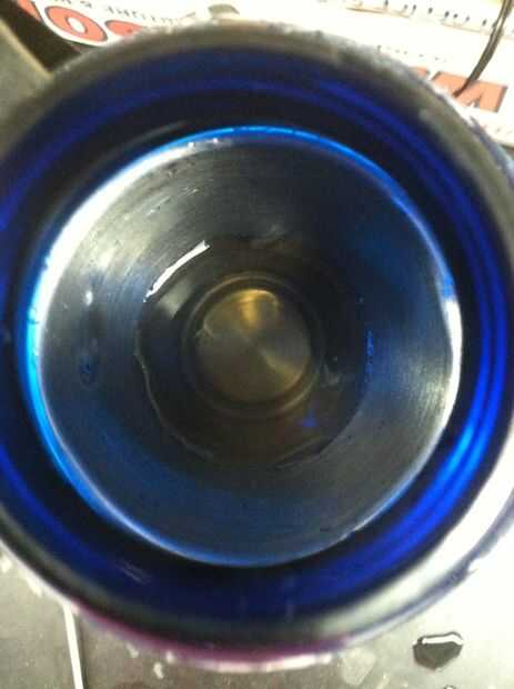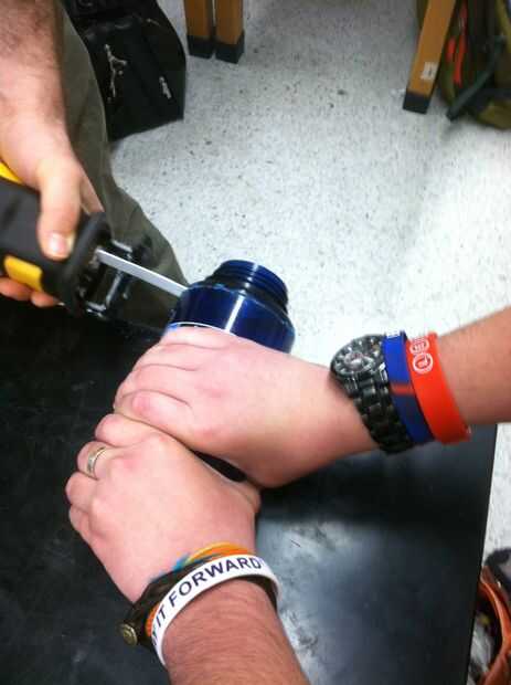 Cortan la parte "estriada" de la botella con una sierra eléctrica; la Copa se inserta en la botella.