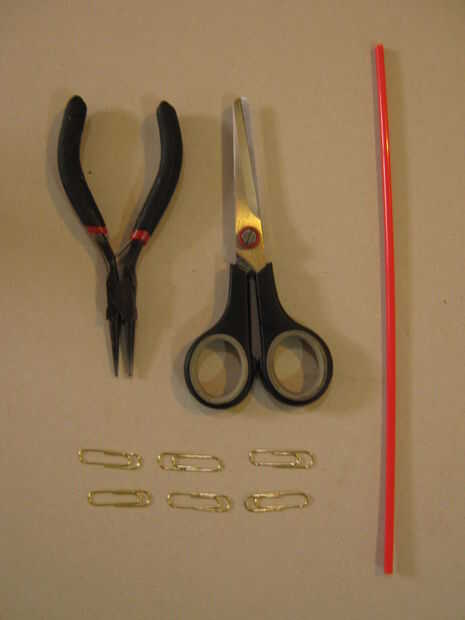 conseguir unos vasos de papel, pajitas de plástico, clips de oficina, tijeras, pegamento y pinzas.