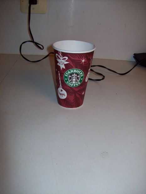 No tomo fotos de la RoofCoffeeCup original, pero StarBucks usa tazas especiales alrededor de las vacaciones, así que vamos a utilizar una taza nueva para este Instructable. Primero debe obtener una taza. Yo generalmente simplemente vea la basura latas fuera de StarBucks, luego llevarlos a casa y lave hacia fuera. Verificar para asegurarse de que no tienen ninguna escritura sobre ellos, están en buenas condiciones sin fugas/manchas y suelen utilizar la mediana. Asegúrese de que obtener la tapa así. Llevarlos a casa y darles un rápido enjuague y seque. Que no quieras llegar mojada en el exterior, o bien puede ser que consigas un punto débil. Una vez seco, está listo para comenzar.