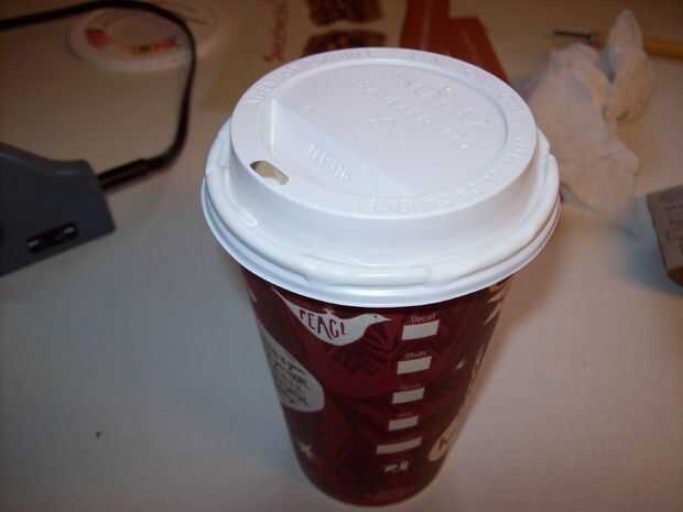 Asegúrese de que todo es como le gusta, porque una vez que se realiza el siguiente paso, no es volver dentro. Coloque la tapa y asegúrese de que el labio no es cubierto por nada. Aplique una tira de pegamento alrededor de la ranura de las tapas y golpear sobre la Copa. Mi cola era un poco demasiado caliente cuando lo hice, y la tapa tazas derretido debido a él. Pero en apretado, así que nada puedo hacer. Generalmente el agujero en la tapa del sello, así sin aire/viento puede entrar y pop arriba o causar arrastre para soplar posiblemente.