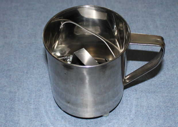 Utilizamos un cortador de la mosca para hacer el agujero en la parte inferior de la taza de café (taza).