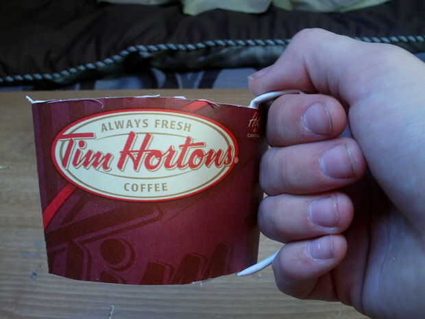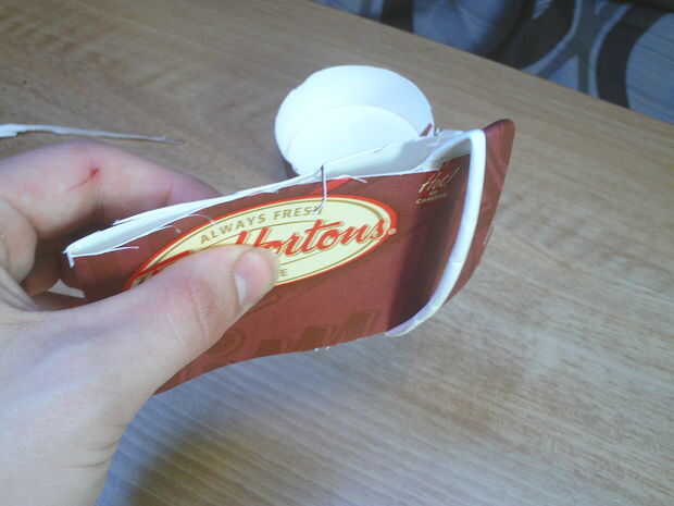 cómo hacer las mangas que encontrará en algunos cafés que mantienen los dedos de salir demasiado caliente, una taza de caféPaso 1: Rodillo del labio Retroceder el borde superior de la taza con el pulgar hasta que quede plano. Sólo Coloque la punta de