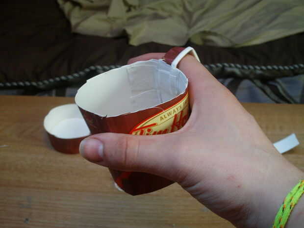 Ahora tienes que hacer un mango. Usted puede han calculado esto, pero la parte superior es el mango. doblez a 1 cm (0,3 pulgadas) a ambos lados y de la forma cónica les al interior de la taza para que el centro está en el exterior de la Copa. No la cinta en un pliegue, o no podrás poner en tu bolsillo.