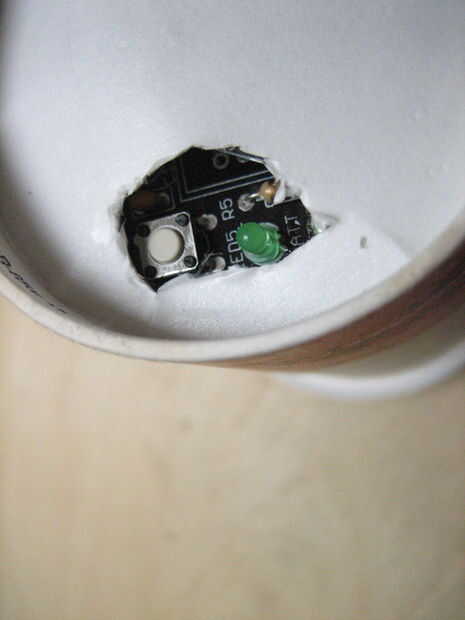 Cortar un agujero en el fondo de la taza donde se encuentran los LED verde y pulsador.