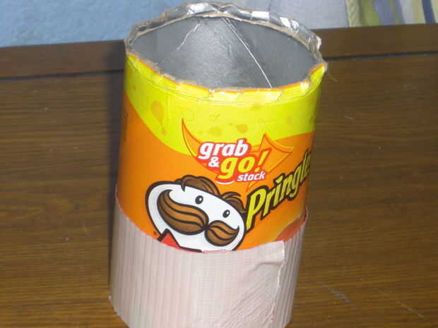 Ahora que tienes tu taza o cilindro (en mi caso utilicé una lata de pringles snack) necesita envolver el lado pegajoso de la cinta del conducto hacia fuera alrededor de la taza o el cilindro. y tenga en cuenta que usted deben youse tiras de cinta adhesiva como en la imagen. por favor, hacer esto hasta que estés en el borde del cilindro.