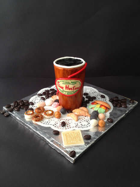 Esta taza de café comestibles está hecha de chocolate fudge cake con glaseado de vainilla. Todas las decoraciones son comestibles, que representan productos de panadería que ofrece Tim Hortons. Los granos de café son Hornear patatas fritas con sabor a capuchino.