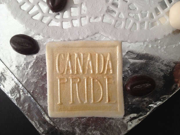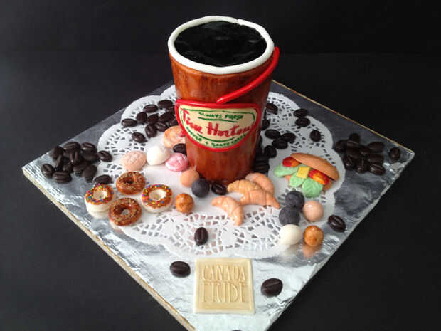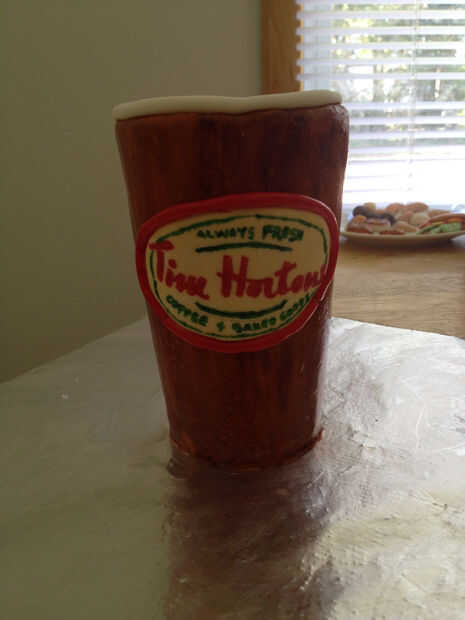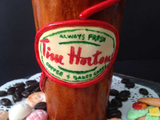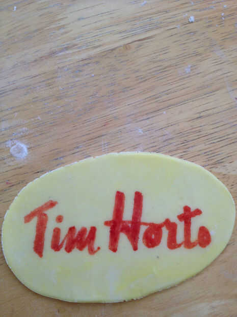 Hacer el logo de Tim Hortons con fondant y pluma de alimentos comestibles. Fije a la tarta mojando la parte posterior del logotipo con un poco de agua.