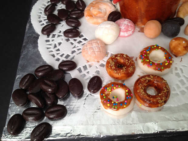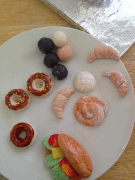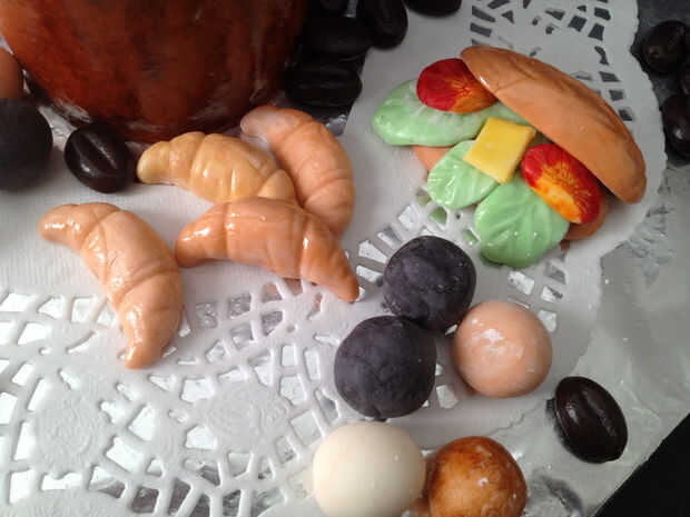 Fondant de color y forma a croissant y sándwich u otros dulces.