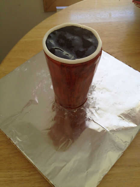 Color de un trozo de fondant blanco con alimentos de gel negro. Rodillo plana y cubrir la parte superior de la 'cup' como café. Corte con cuchillo/tijera.