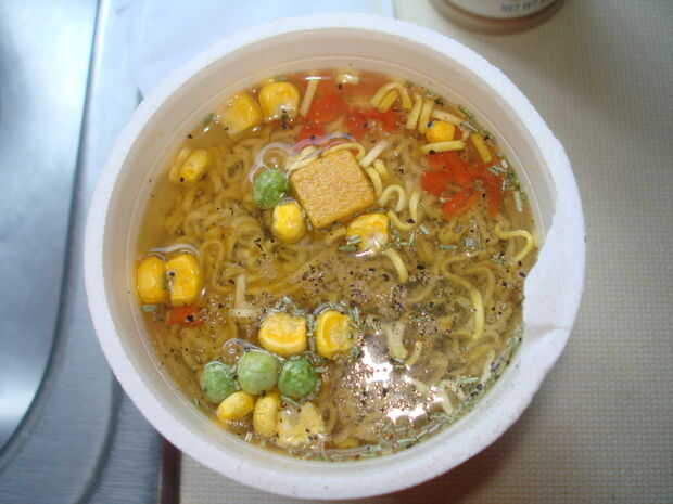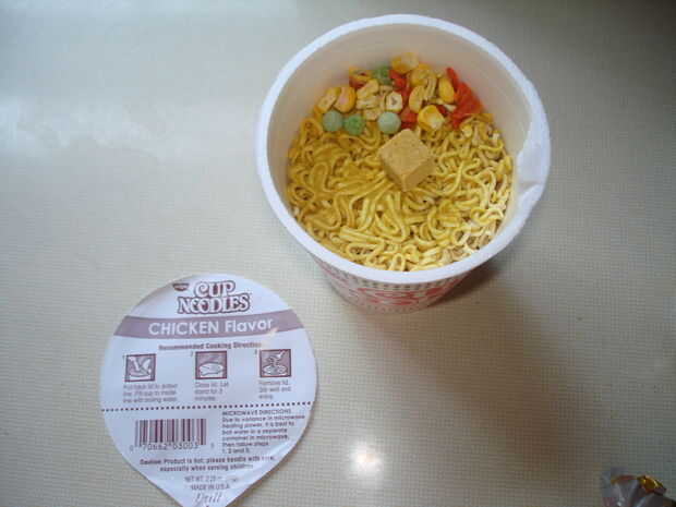 En primer lugar, comletely Retire la parte superior y tirar en el cubo de lingotes. Añadir especias y agua. Poner en el microondas durante unos minutos.