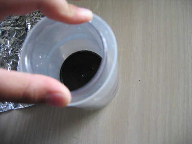 Primero ir al fregadero y poner el agua en la taza grande llenar 1/3 o prueba que fuera poniendo la Copa más pequeña en el centro de la taza grande. Asegúrese de que vas a tener que alinear la taza pequeña en la mitad de la gran Copa.