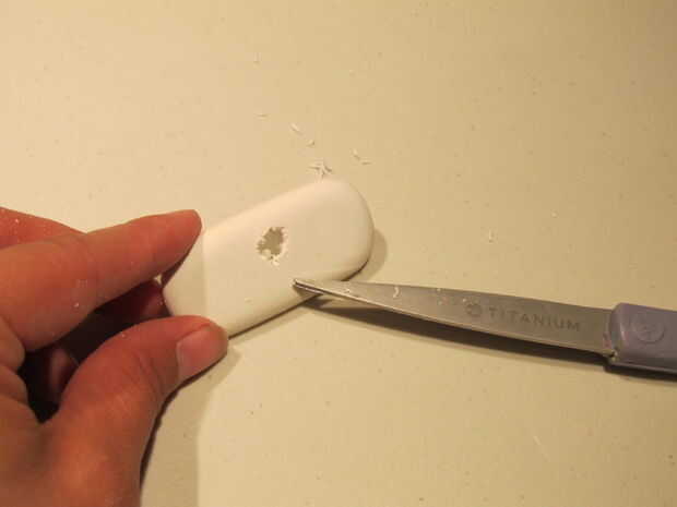4. tomar el borrador grande y perfore un agujero cerca del centro con un par de tijeras. Es necesario el orificio sea lo suficientemente grande como para caber al final de la Copa de succión en. (Si el borrador no es redondo todo listo en los bordes, utilice un par de tijeras para redondear demasiado)