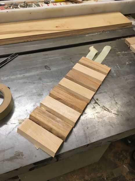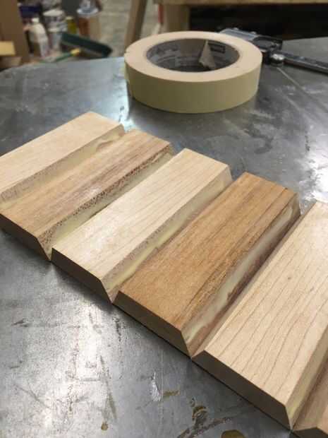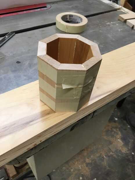Había trazado de las piezas, alternando entre los dos tipos de arce y había atado con cinta de enmascarar. Esto es donde las fotos comenzaron a ser tomado otra vez. Después de un dry-fit, nos habían encerado todas las caras que serían dentro de la taza y pone pegamento en las articulaciones.