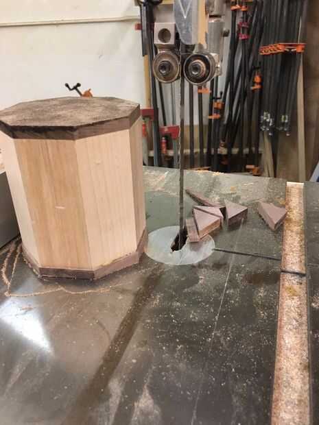 Una vez que se secaba el pegamento inicial hacia arriba, cortan los extremos en la tronzadora para asegurarse de que la parte superior e inferior de la Copa fueron nivel. Quería un color contrastante en la parte superior e inferior de la Copa, así que asierra por algunas plazas de la nuez en la Sierra de cinta y había aplanado con la lijadora de tambor. Pega la pieza inferior en con unas pinzas.