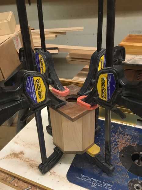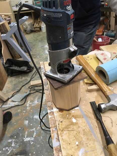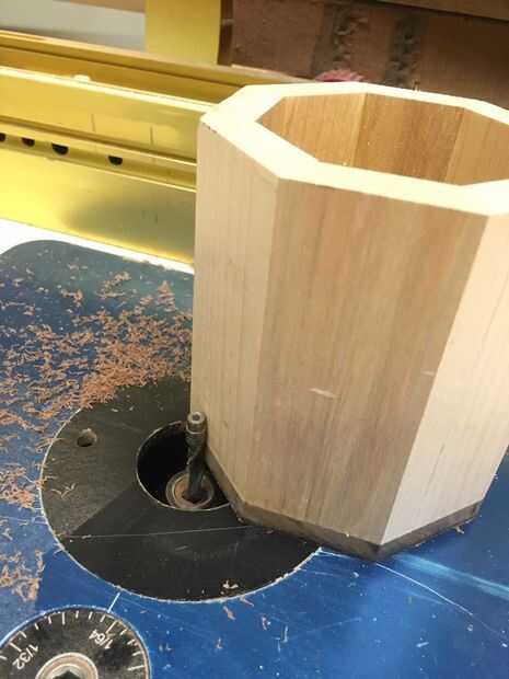 Para la parte superior e inferior, el plan era pegar, cortar la parte sobrante en la Sierra de cinta, y cortar al ras con la mesa de fresadora. Sin embargo, la parte superior deba estar abierta, por lo que hemos perforado un agujero grande con una pieza Forstner antes que pegué en. Entonces, usando el router de mano, recortar el interior al ras. Creo que en el momento, la mesa de fresadora se creó para otro proyecto, razón por la cual acabé podando la parte superior con el router de mano. Esto hizo un poco enlodado, puesto que hay menos superficie para deslizarse a lo largo, pero funcionó.