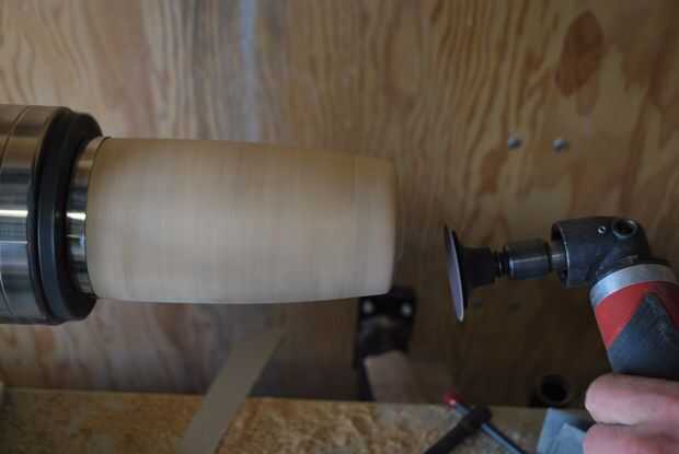 La parte inferior del hueco formas es siempre donde lucho al máximo. En este caso mi estrategia era poco ortodoxo pero muy exitoso. Usé el mandril de cuatro mordazas para sostener la parte superior de la taza desde el interior y lija en la parte inferior con una esmeriladora de troquel neumático. He probado usando un formón y un raspador en el extremo, pero el mandril no sostenga la taza lo suficientemente bien como para hacer frente a las fuerzas de una herramienta de torneado real.