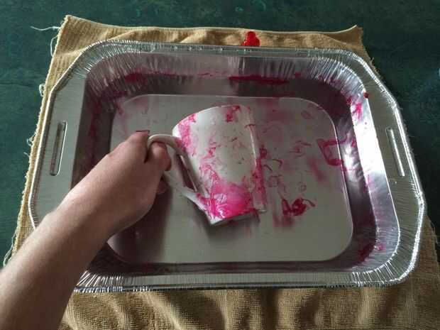 Tenga en cuenta que la manera en que usted mantenga su taza variará dependiendo del tamaño de su contenedor. Para un recipiente poco profundo, como el ilustrado, es más fácil agarrar la taza por el asa y gire de lado a lado en el agua. Para un recipiente más pequeño pero más profundo, es más fácil sostener la taza por su borde superior y sumergir en el agua. También nota que resultado final variará dependiendo de qué manera la taza se lleva a cabo.