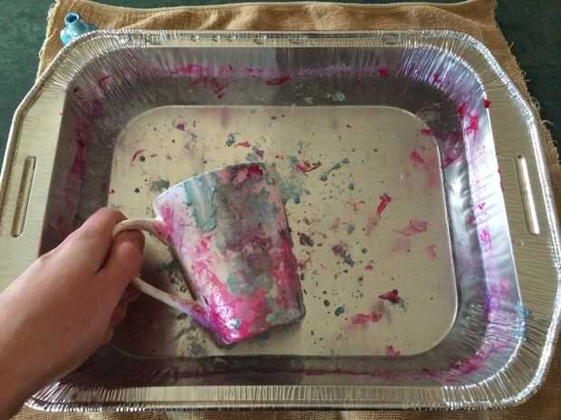 Una vez seca la taza, repita el paso 4 con el otro había deseado color. A continuación, repita los pasos 5-7. Después de la taza está completamente seca y se añaden todos los colores deseados, quite cualquier pegatinas o calcomanías que puede han optado por utilizar. Tenga cuidado al quitar las pegatinas o calcomanías como pueden sacar alrededor de esmalte de uñas.