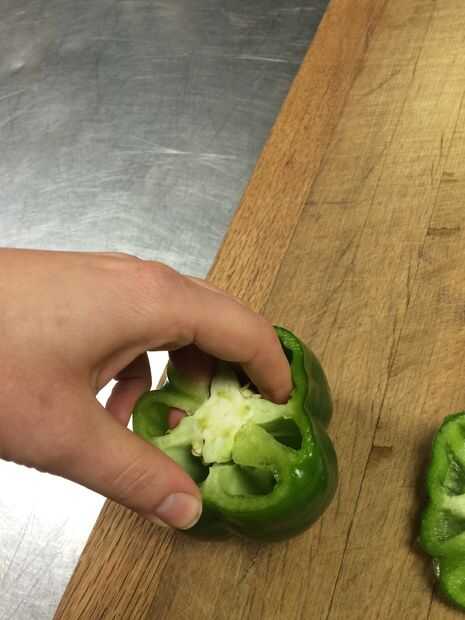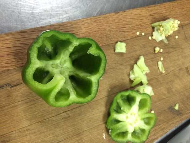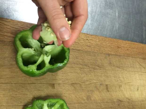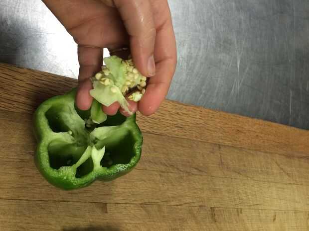Ahora Limpie el pimiento. El pimiento es hueco por dentro. Tiene un montón de semillas y algún tejido blanco carnoso apoyando las semillas. Sacar las semillas y como gran parte del tejido blanco carnoso como usted puede. El tejido blanco carnoso es comestible, pero no tienen buen sabor.