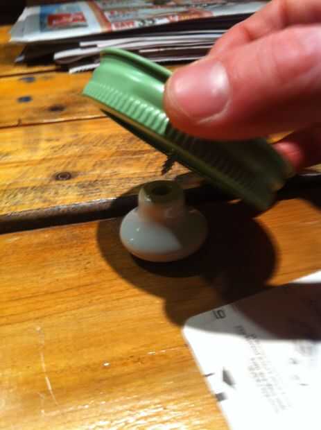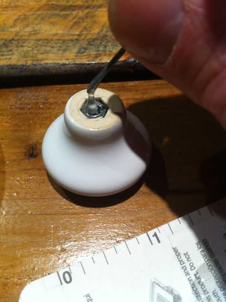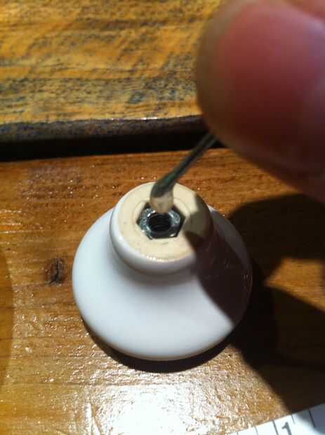 Alimentación/hilo de rosca del perno de ojo para arriba a través de la parte inferior de la tapa en el agujero que ha perforado. Los hilos deben que sobresalen de la parte superior de la tapa. A continuación, llene la parte roscada hembra de la perilla con pegamento epoxi y centro en las roscas macho de la armella y deje que el pegamento fijar (preferiblemente durante la noche).