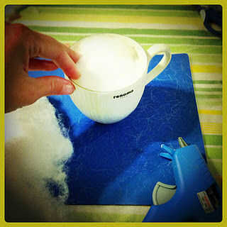 Ahora quieres agregar su relleno de fibra a tu taza de té. Tratar de compactar tanto relleno de fibra en la taza de té como pueda pero sólo una pulgada de la parte superior. Quieres espacio para caliente pegamento en su chaqueta de piel falsa. (Tip: pegamento caliente los lados del relleno de fibra en su taza de té. Ayuda a mantener bajo y compacto. Aunque no caliente pegamento la mitad superior del relleno de fibra. Si esto se hace entonces usted tendrá dificultad para insertar sus pernos rectos de tu alfiletero.)