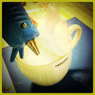 Último pero no menos importante es la caliente pegado de la piel del faux! ¡ Yay! Ya casi terminamos! Tomar su chaqueta y comenzar con una de las pestañas. Encolarla mirando hacia el interior y su forma de trabajo alrededor de su taza de té caliente. Caliente pegar el círculo entero de piel sintética en su taza de té y disfrutar! Sí, es fácil chicos! Nuevo alfiletero con poco o sin ningún costo!