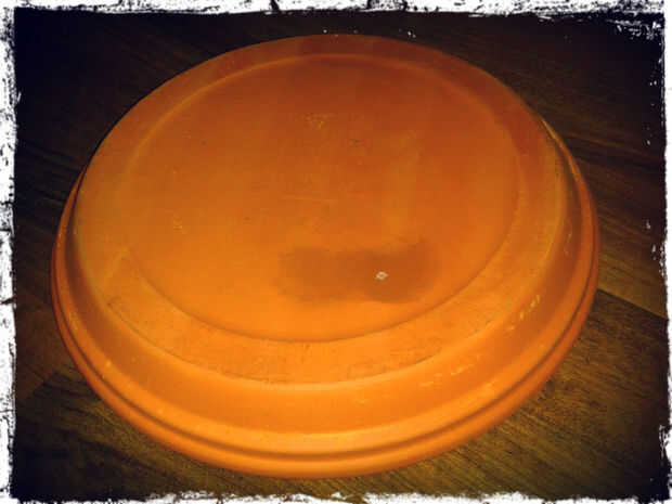 Tomar las etiquetas fuera del plato de terracota y Voltéela boca abajo. Esto se convertirá en su base.