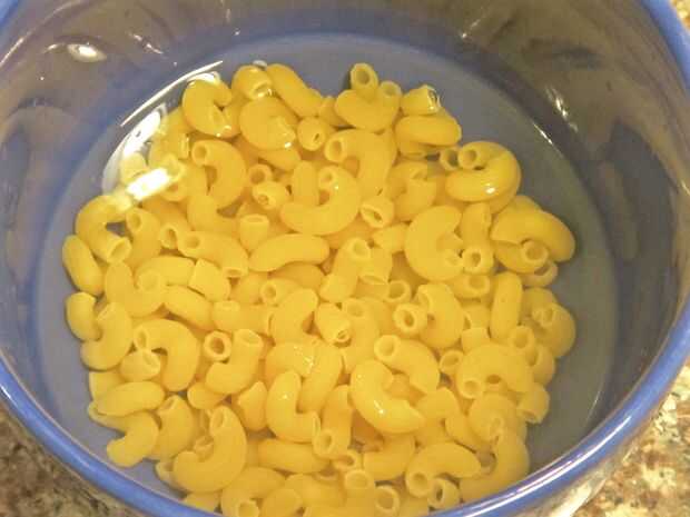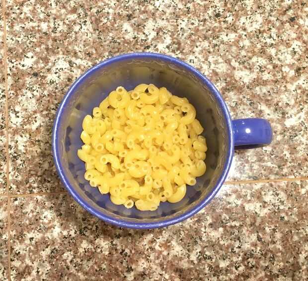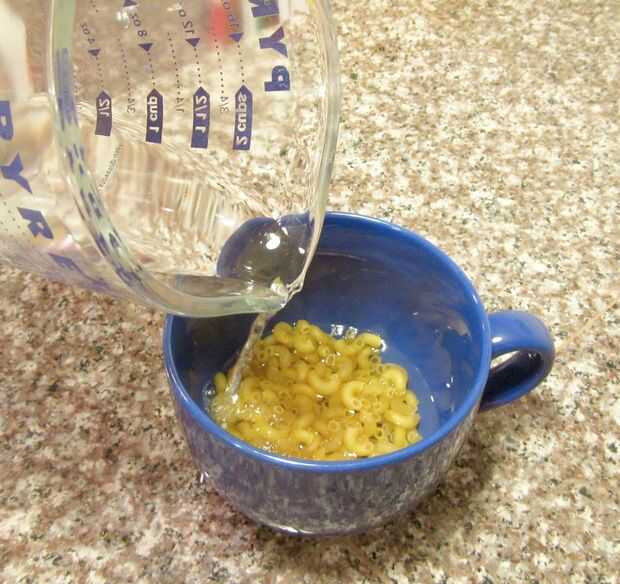 Vierta la pasta de 1/3 taza de elección en su taza. Cubrir con 1/2 taza de agua. Coloque en el microondas y calentar durante un minuto en high. Retire la taza del microondas y remover. Calentar nuevamente por otro minuto en alto y revolver. Repita este proceso dos veces más, para que al final habremos calentado/cocinado la pasta para un total de cuatro minutos y remueve cuatro veces. Cuando haya terminado, todavía puede haber un poquito de agua en la parte inferior de tus fideos. Puede microondas su taza durante 30-60 segundos o lo dejas. Decidí dejarlo en lugar de potencialmente secar los fideos.