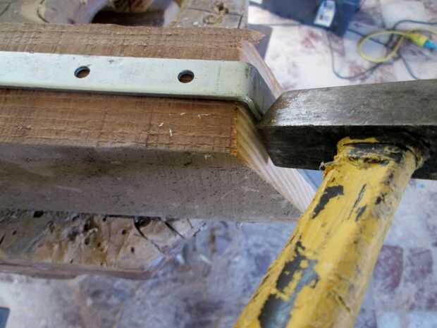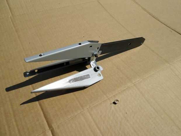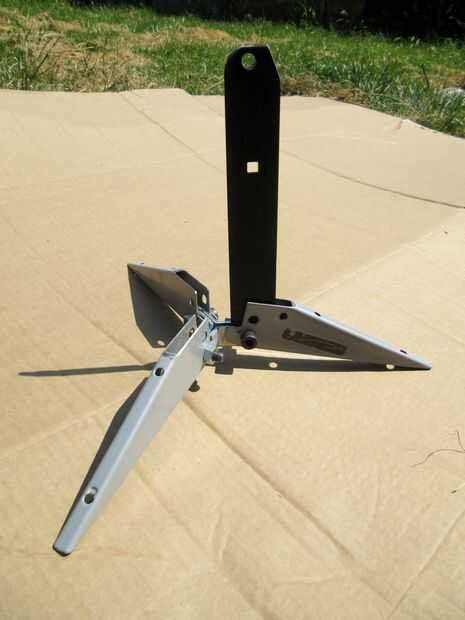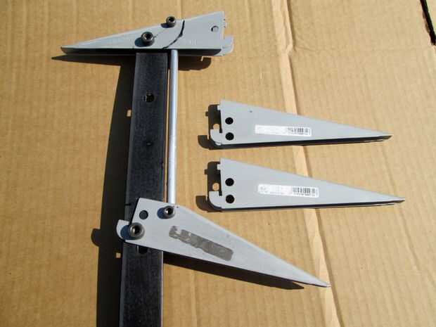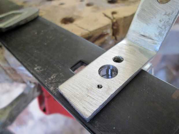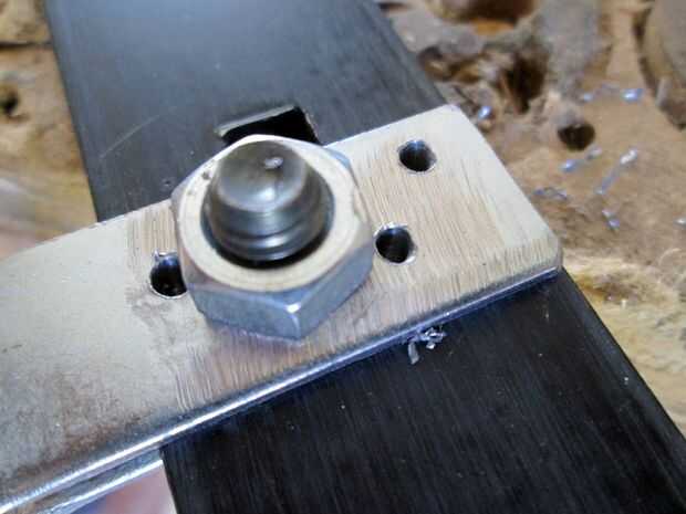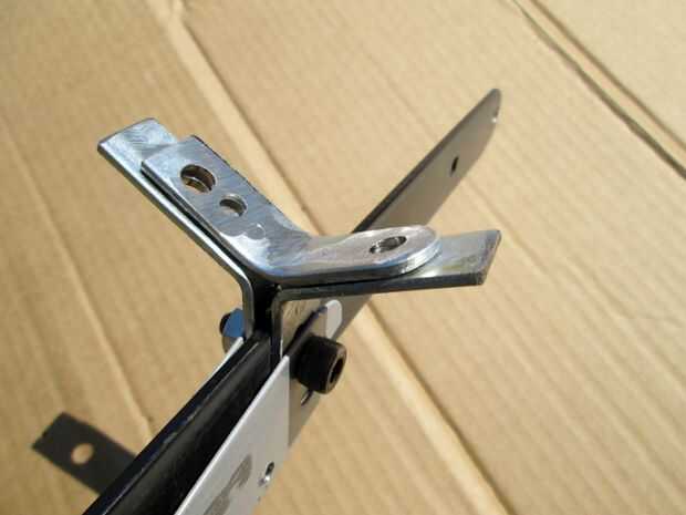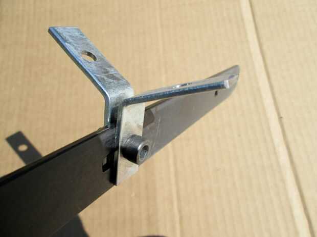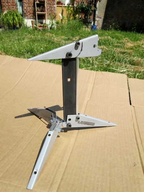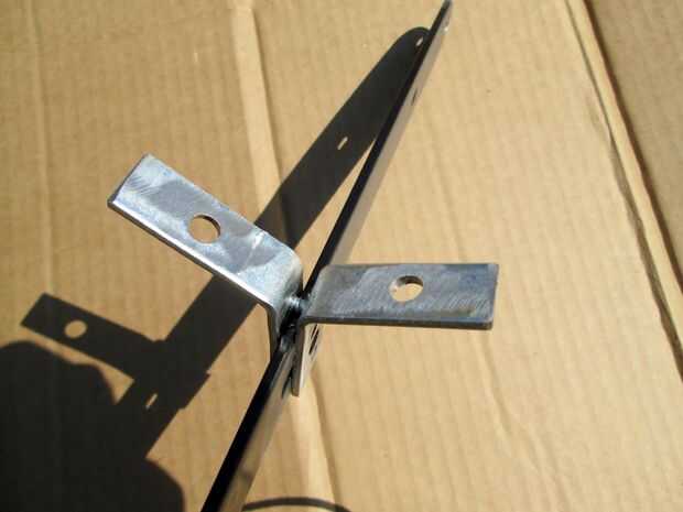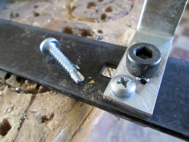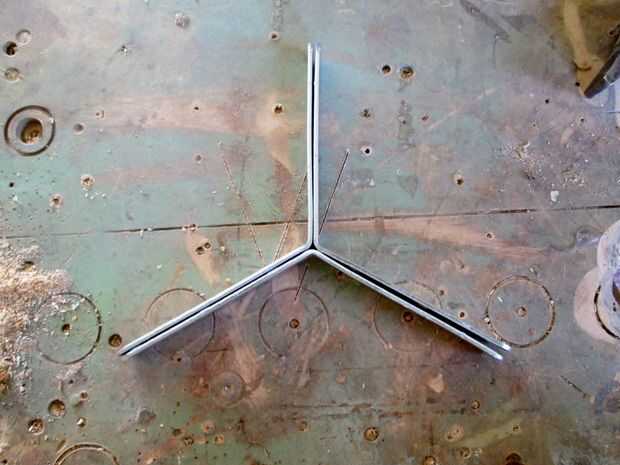 Para agregar dos más leggs, iniciar dos V (120 º) de flexión de unos 90° de esquinas que lo arreglamos con un tornillo grande para la columna vertebral (arreglo temporal). Después de haber perforado unos agujeros más pequeños directamente a través de las tres capas puede atornillar unos tornillos a través de las tres capas, que te aprieta sólo correctamente en el extremo (ambos lados). Sólido, agradable y no necesitan soldadura.