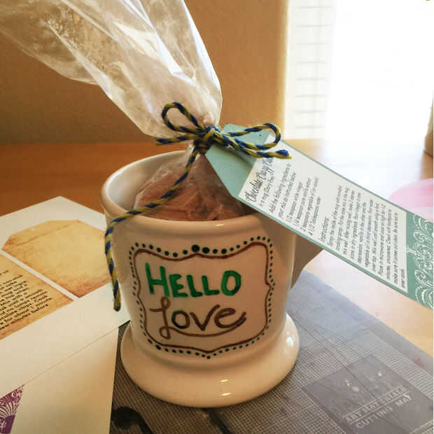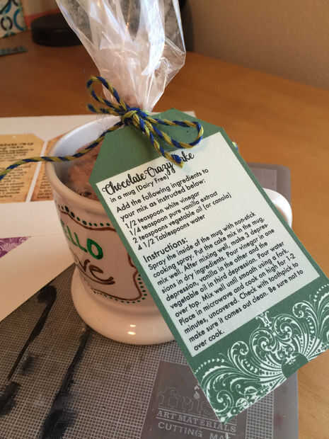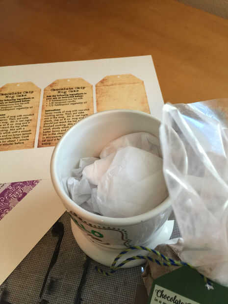 Cierre de la bolsa de celofán con su opción de la cinta, cuerda o cadena. Imprimir y recortar la etiqueta de la torta de la taza, hacer un agujero en la parte superior, fije a la manija de la taza o en la parte superior de la bolsa de celofán con cinta, cuerda o guita. Puede utilizar papel de seda en el fondo de su taza para llenar la taza más si es necesario.