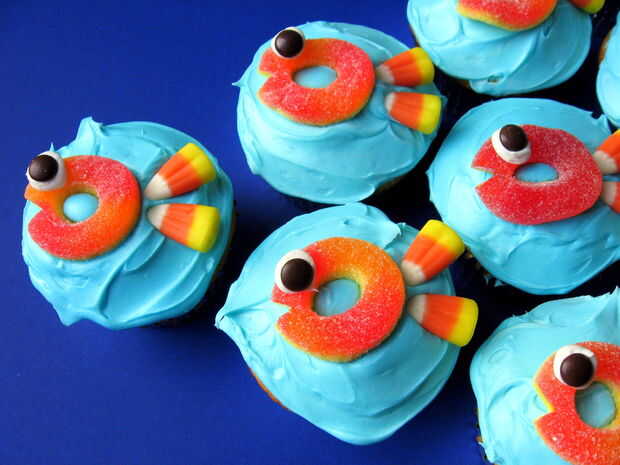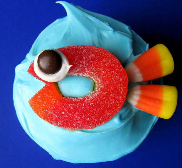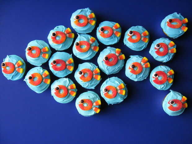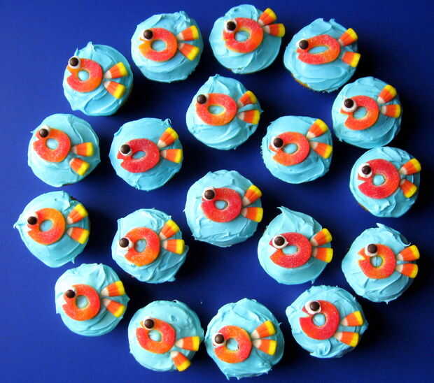 ojos melocotón Candy Gummies, Mini M & M, colas de maíz de caramelo. Cortar solo un un triángulo en cada gummie O una sonrisa y añadir un poco de glaseado para el mini M & M ojo. Súper fácil "escuela" de pescado.