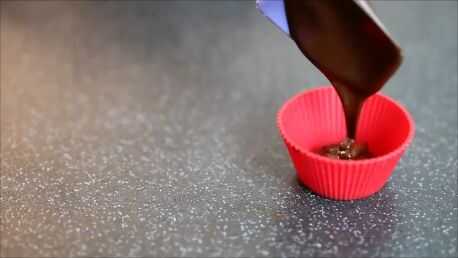 Tomar algunos moldes para formar las copas. He utilizado moldes de Magdalena de silicona mini pero forrado de papel cupcake liners será perfectas para hacer el trabajo y es mucho más fáciles así. Poner dos cucharaditas de chocolate dentro de cada molde y girar los moldes para que el chocolate alcanza todos los rincones. Asegúrese de que hay suficiente chocolate en la parte inferior, ya que va a mantener la forma. Poner los moldes en el congelador durante 15 minutos a escalofríos.