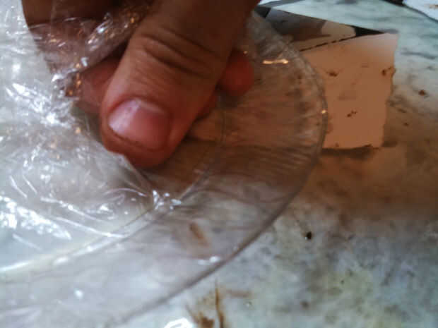 Un buen trozo de cling wrap y tire sobre la placa, asegurándose de que tiró firmemente, esto ayudará a prevenir las arrugas que se transferirán a la textura del chocolate. ¿Quién realmente quiere arrugas en su chocolate?