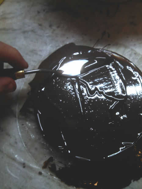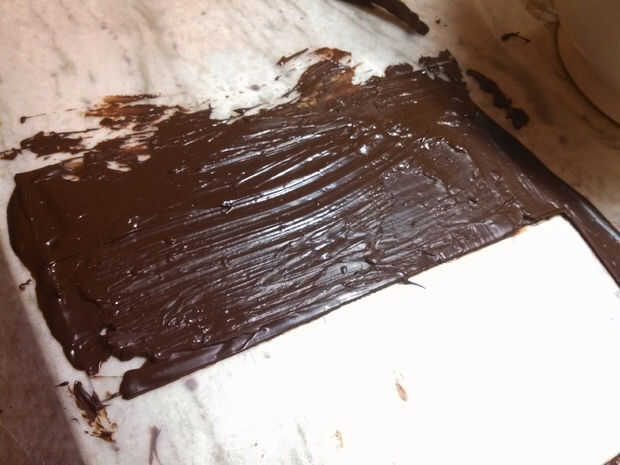 Utilice la espátula para untar en el chocolate asegurándose de que usted llene todos los huecos y mantener un espesor uniforme.