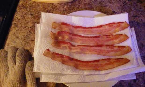 El exterior e inferior de las tazas se van a partir de bacon. Empiece por precalentar el horno a 250 º. Tomar las rebanadas de tocino y ponerlos sobre la parrilla para asar. Deje espacio suficiente entre las rodajas para que la grasa goteará a través de la rejilla. Hornea el tocino durante 30 minutos, convirtiendo a mitad de camino a través. Quieres el tocino para cocinar, pero se necesita todavía ser flexible. Además, pruebe a quitar tanto la grasa como sea posible. Recomiendo borrar la grasa apagado con una servilleta o toalla de papel. Puede parecer mucho tiempo, pero la diferencia es bien vale la pena el esfuerzo.