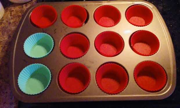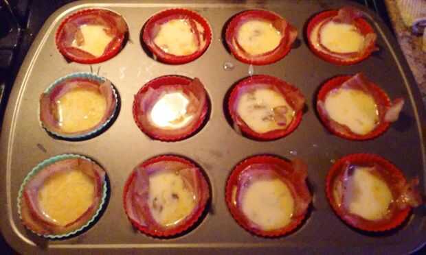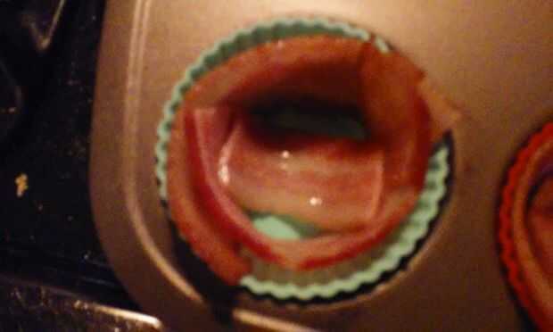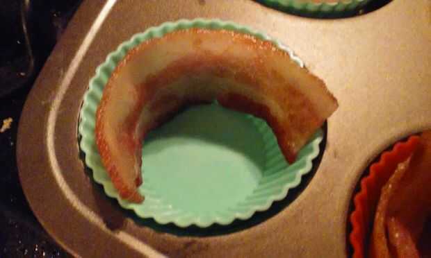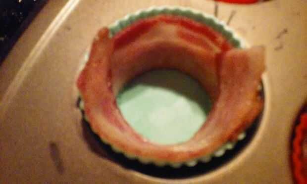 Saque su muffin tazas de lata y hornear. Utilicé la versión de silicona para las fotos, pero desde entonces he cambiado a las versiones de papel/papel de aluminio. Tomar dos mitades de tocino y poner uno a cada lado de las tazas. Luego, tomar un tercio de tocino y pone que en la parte inferior, con las esquinas contra las otras rebanadas. Si desea utilizar papas o pan tostado, este es el momento en que usted lo puso en la parte inferior de las tazas (encima el tocino).
